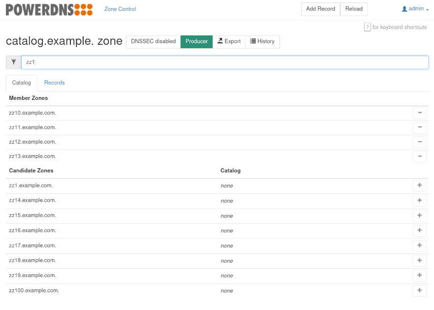 The zone page of a Producer zone has one extra element compared to other zone kinds: the “Catalog” tab. Inside this element zones can be added and removed from the Producer’s catalog. The [+] button will add a candidate zone to the catalog and the [-] button will remove a member zone from the catalog.