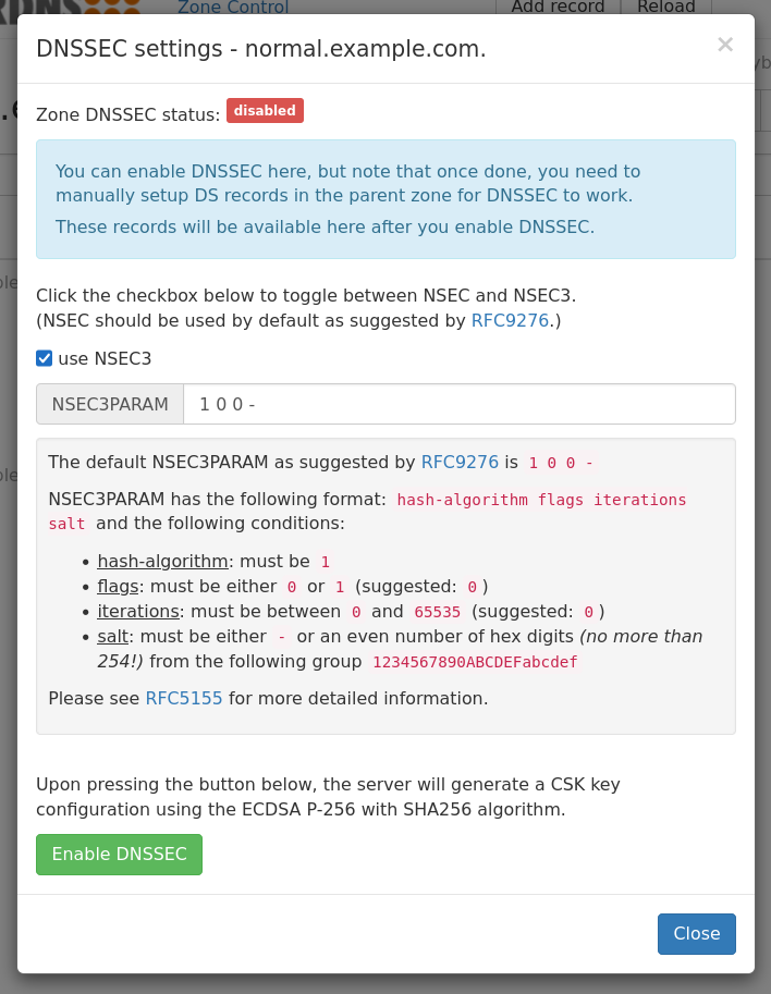 By default NSEC will be used for DNSSEC. Checking the “use NSEC3” box will show an expanded dialog where one can edit the NSEC3PARAM.