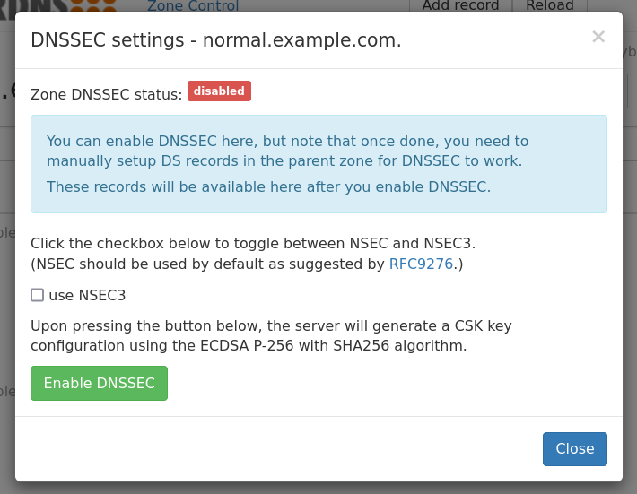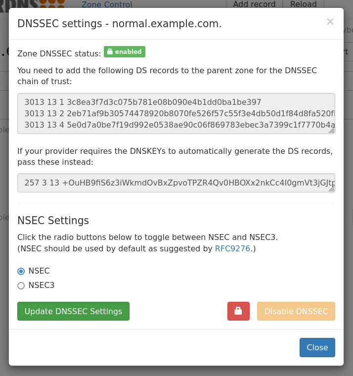 Clicking the “Enable DNSSEC” button will enable DNSSEC for the zone. This adds cryptographic keys based on the settings of the PowerDNS Authoritative Server.