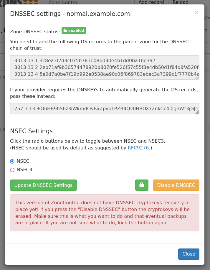 It is possible to disable DNSSEC here but be very careful with this (as shown in Fig. 15) as we do not have backup functionality in place in this version of ZoneControl. The “Disable DNSSEC” button will be disabled until one enables it by pressing the red lock / unlock button.