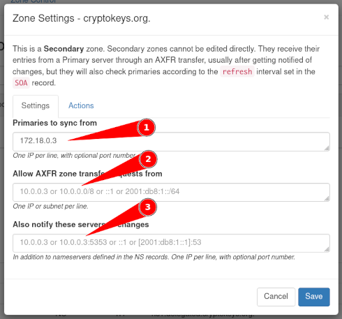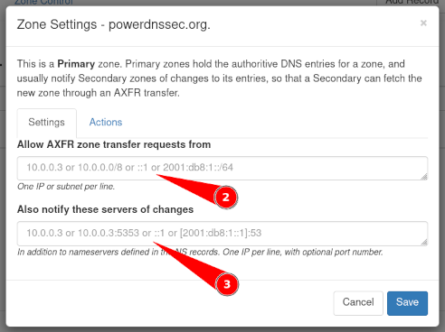 The IP adresses entered in the field at 3 will be notified when the zone has been changed, in addition to all the servers