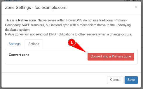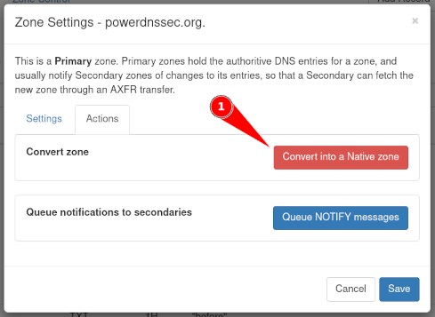 Changing from a native zone to a primary zone might require extra configuration in the PowerDNS Authoritative Server.
