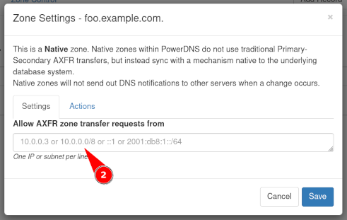 As it is possible for native zones to be replicated via AXFR, the field at 2 allows configuration of IP addresses that may transfer this zone.