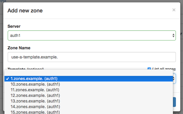 It is also possible to use any existing (“real”) zone as template. When the “List all zones” box is checked all available zones will be shown to use as a template. See Fig. 22.