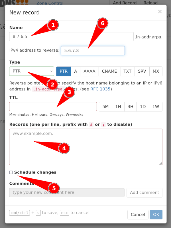 When adding PTR records for the in-addr.arpa or ip6.arpa zones there will be an additional input field, 6, where the “normal” (non-reversed) IP address can be entered which will then be reversed and put into the Name field (1).